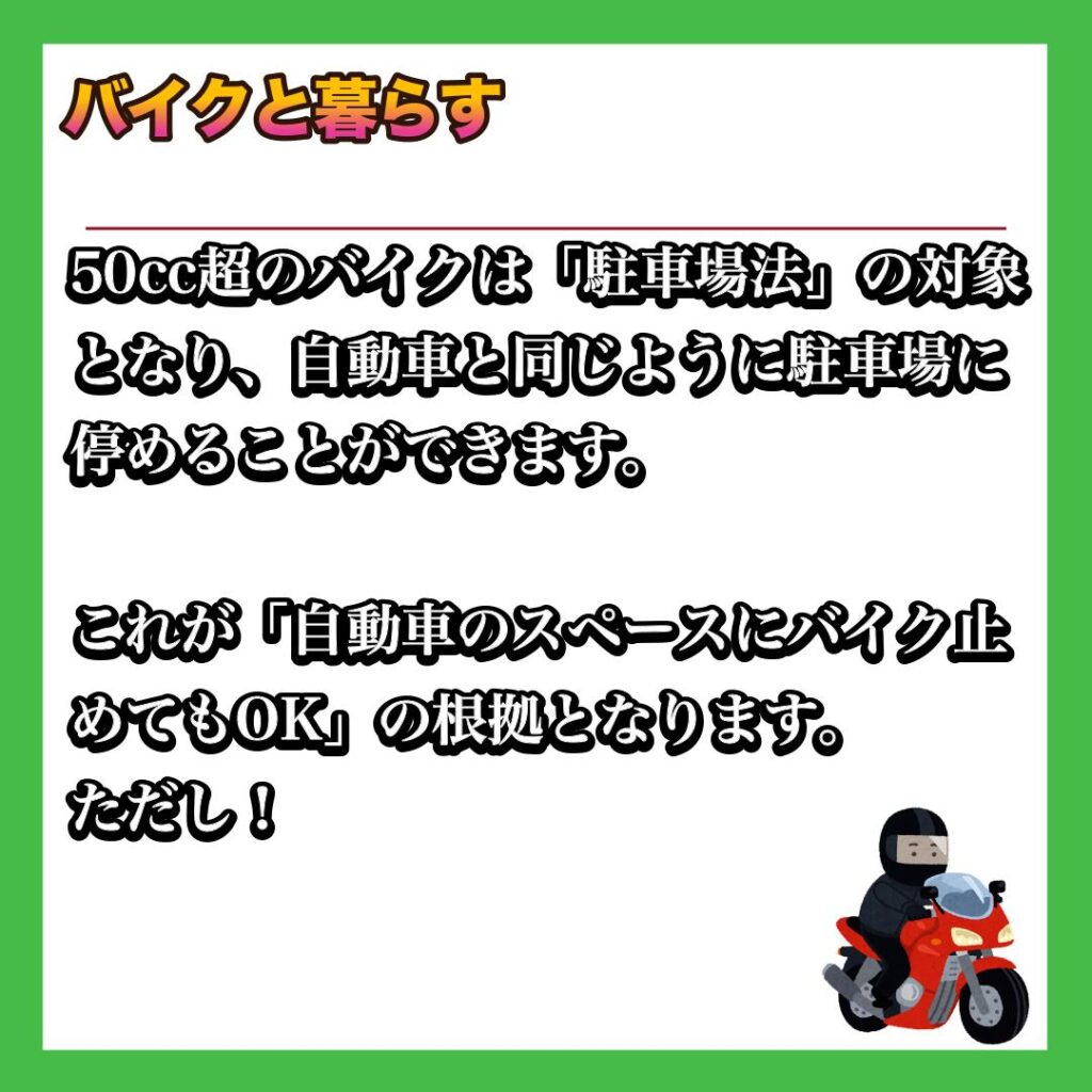 50㏄超のバイクは「自動車」という扱いになるので、自動車のスペースに停めることが正しい運用になりますが、あまりこの事実が一般に知られていない。