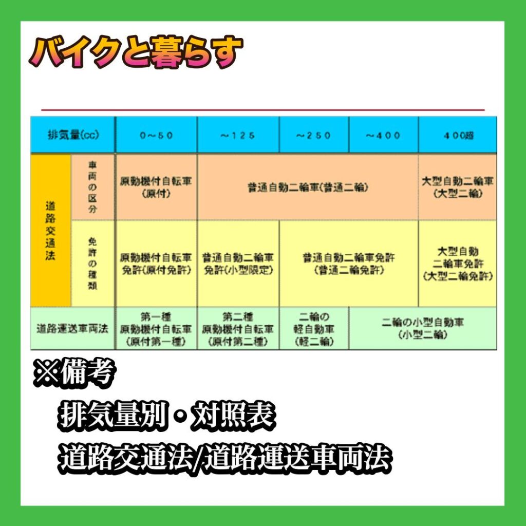 道路交通法では免許の区分も異なりまして、50cc以下は「原付免許」、50cc超~125㏄以下は「普通自動二輪の小型限定免許」、125超~400cc以下で「普通自動二輪免許」、400cc超で「大型自動二輪免許」としています。