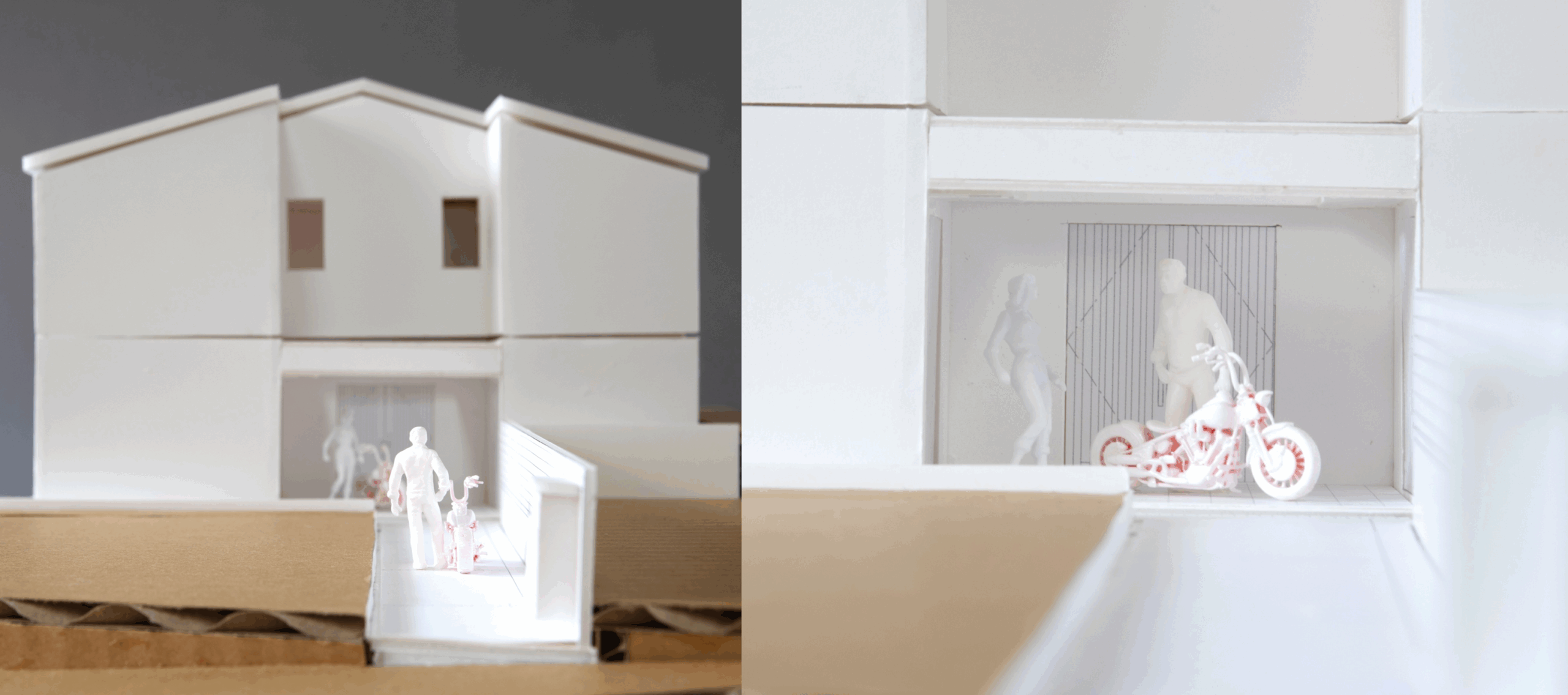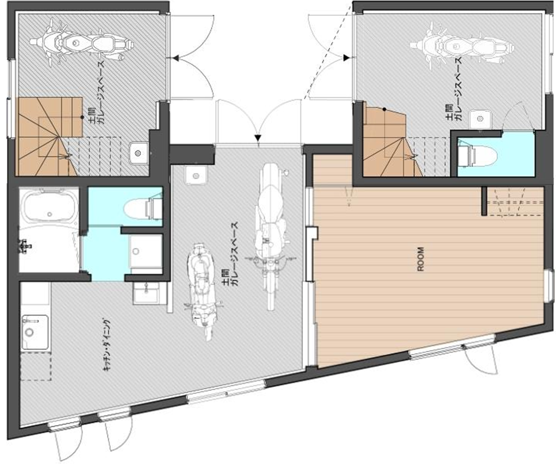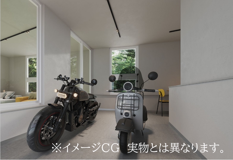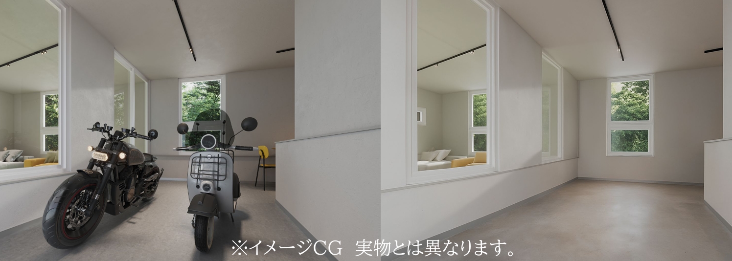 居住スペースをすべて2Fに置くことで、バイク用ガレージと居住性を両立した部屋となります。