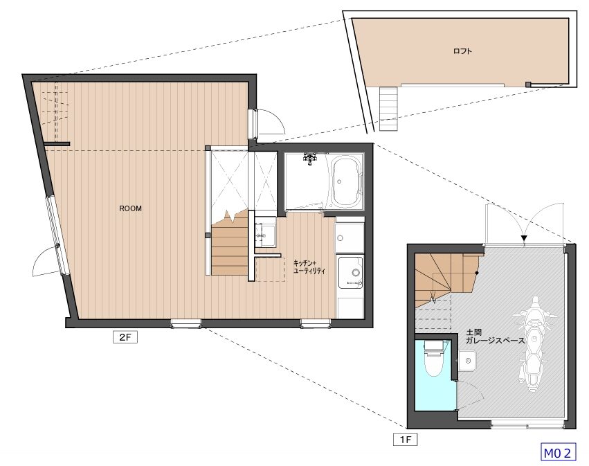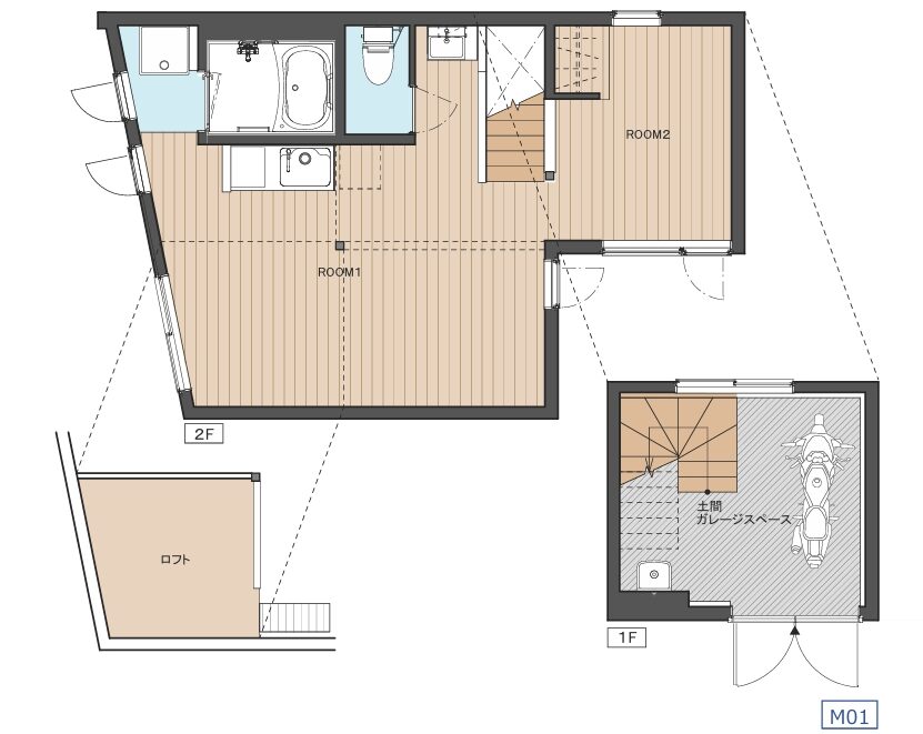 1F、2Fにまたがるメゾネットタイプの「M01」「M02」は1Fを大型オートバイ1台が余裕で置けるガレージスペースを中心にしたオートバイ専用といえる区画。